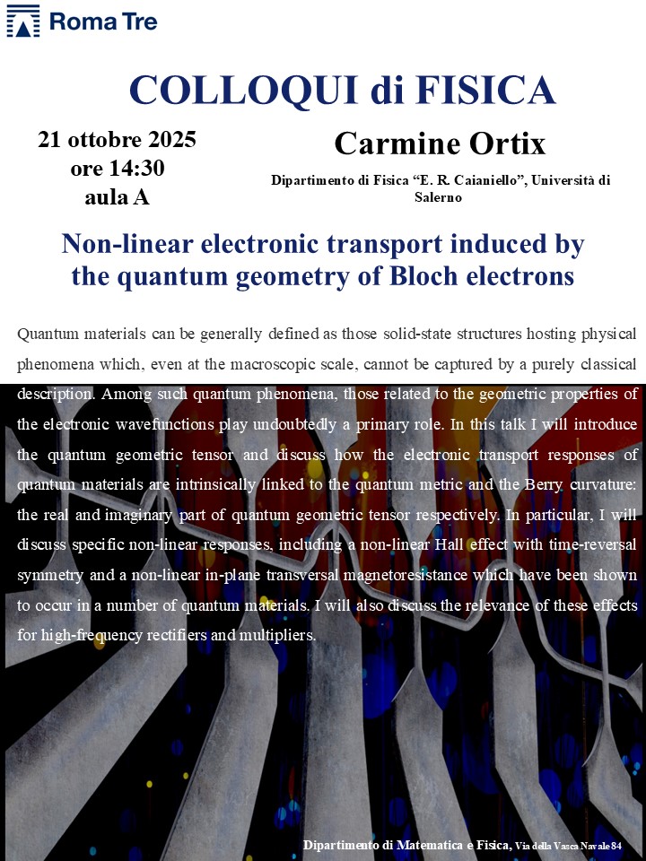 Martedì 21 ottobre 2025 alle ore 14:30, il Prof. Carmine Ortix del Dipartimento di Fisica “E. R. Caianiello” dell'Università di Salerno terrà il Colloquio di Fisica dal titolo "Non-linear electronic transport induced by the quantum geometry of Bloch electrons".