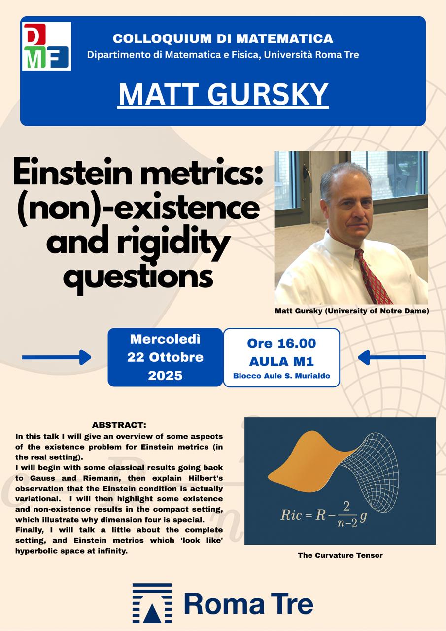 Mercoledì 22 ottobre alle ore 16:00 , il Prof. Matt Gursky (University of Notre Dame) terrà un Colloquium di Matematica dal titolo "Einstein metrics: (non)-existence and rigidity questions".
